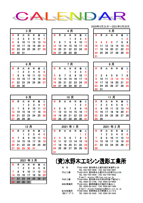 「2020年度年間休日表をupしました」
